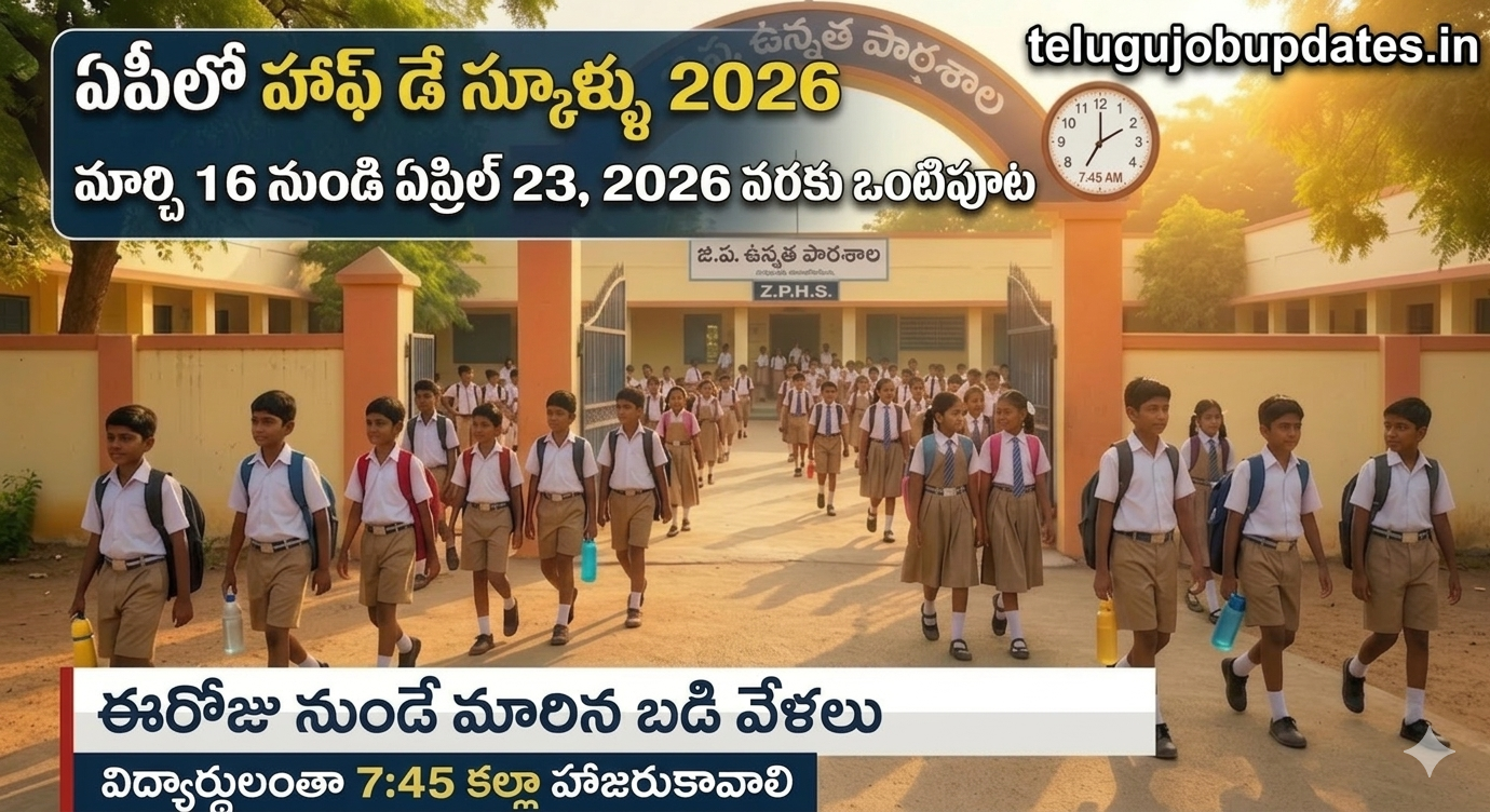 ఆంధ్రప్రదేశ్ రాష్ట్రంలో విద్యార్థుల ఆరోగ్యం దృష్ట్యా ప్రభుత్వం ముఖ్యమైన నిర్ణయం తీసుకుంది. రాష్ట్రంలో ఎండల తీవ్రత పెరుగుతున్న నేపథ్యంలో పాఠశాలల పనివేళలను మార్చుతూ ఒంటిపూట బడులు (Half Day Schools) నిర్వహించాలని విద్యాశాఖ ప్రకటించింది. ఈ మార్పులు మార్చి 16, 2026 నుండి అమల్లోకి వస్తాయి.