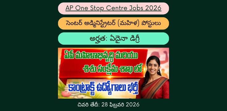 ఆంధ్రప్రదేశ్ రాష్ట్రంలోని మహిళా & శిశు సంక్షేమ శాఖ పరిధిలోని శ్రీ సత్యసాయి జిల్లాలో One Stop Centre లో ఉద్యోగ భర్తీకి అధికారిక నోటిఫికేషన్ విడుదలైంది. ఈ ప్రకటన ద్వారా సెంటర్ అడ్మినిస్ట్రేటర్ (మహిళ) పోస్టును కాంట్రాక్ట్ ప్రాతిపదికన భర్తీ చేయనున్నారు. అర్హత కలిగిన మహిళా అభ్యర్థులు ఈ అవకాశాన్ని వినియోగించుకోవచ్చు. దరఖాస్తు చేయడానికి చివరి తేదీ: 28-02-2026 ఈ ఉద్యోగం మహిళల సంక్షేమం, సహాయక సేవలు మరియు అడ్మినిస్ట్రేషన్కు సంబంధించిన కీలక బాధ్యతలను నిర్వహించాల్సి ఉంటుంది. మహిళల సమస్యలకు సమగ్ర సహాయం అందించే One Stop Centre లో ఈ పోస్టుకు ముఖ్యమైన బాధ్యతలు ఉంటాయి.