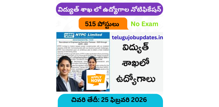 నేషనల్ థర్మల్ పవర్ కార్పొరేషన్ ( NTPC ) నుంచి 515 ఇంజనీరింగ్ ఎగ్జిక్యూటివ్ ట్రైనీ పోస్టులను భర్తీ చేయడానికి ఈ నోటిఫికేషన్ విడుదల చేయడం జరిగింది. అంతేకాకుండా ఇంజనీరింగ్ డిగ్రీ అర్హత కలిగి , గేట్ 2025 లో అర్హత మార్కులు పొందిన వారు ఈ ఉద్యోగాలకి దరఖాస్తు చేసుకోవచ్చు. వయస్సు కూడా 18 నుంచి 27 సంవత్సరాల మధ్య ఉండాలి. ఎటువంటి రాత పరీక్ష లేకుండా గేట్ స్కోర్ ఆధారంగా అభ్యర్థులను షార్ట్ లిస్ట్ చేసి ఇంటర్వ్యూ ద్వారా ఎంపిక చేయడం జరుగుతుంది. మరిన్ని పూర్తి వివరాలు ఇప్పుడు చూద్దాం.