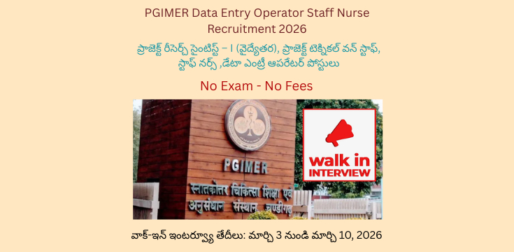 పరీక్ష , ఫీజు లేకుండా 10th అర్హతతో PGIMER లో డేటా ఎంట్రీ ఆపరేటర్ స్టాఫ్ నర్స్ సైంటిస్ట్ ఉద్యోగాల నోటిఫికేషన్ విడుదల… Apply Now :